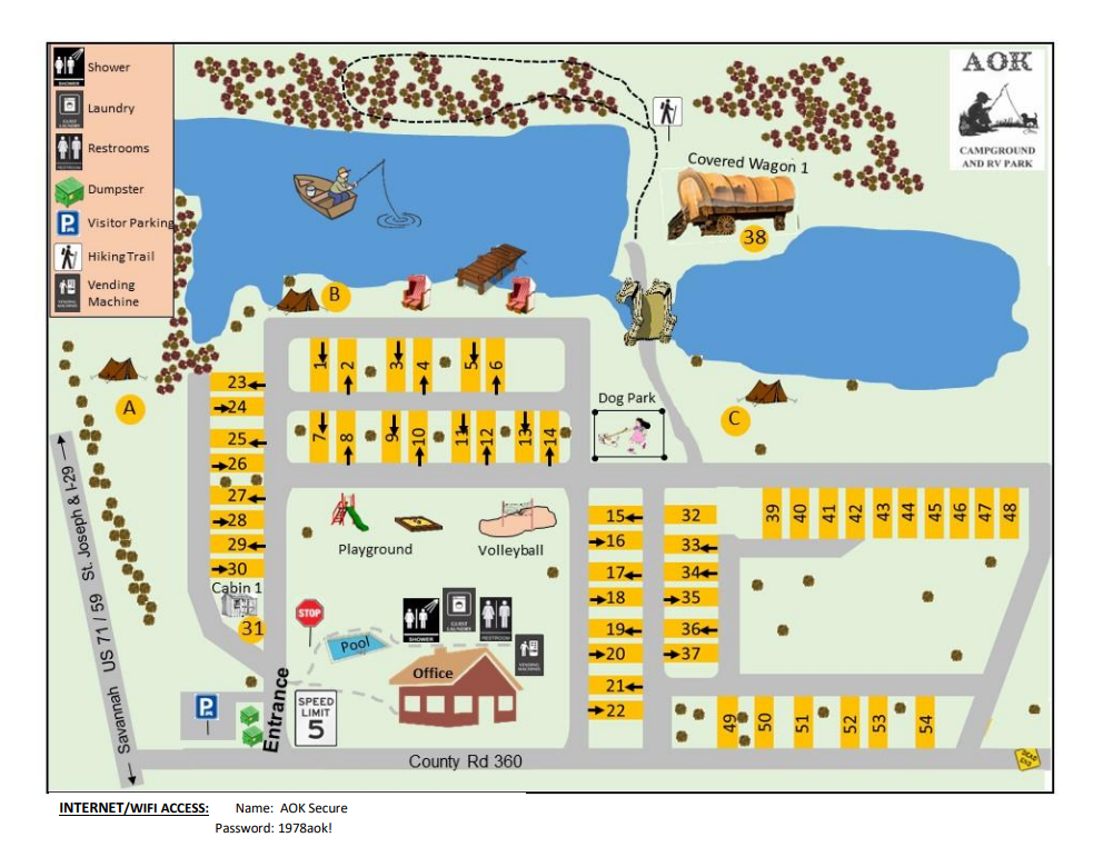 • Most of our sites are pull through. We can accommodate a 37 foot fifth wheel. I am guessing that you need 50 amp service (we can do that also). Yes, your dog(s) can swim in the lake. Currently, we have a guest that plays fetch with his Labrador Retriever. The dog loves it! We have sites available, depending on the date(s) you need. We have taken over 150 reservations for the summer months. The sites are filling up fast. Let us know when you want to come and we will do our best to accommodate your needs. You can email us at aokexit53@gmail.com . We look forward to hearing from you.
